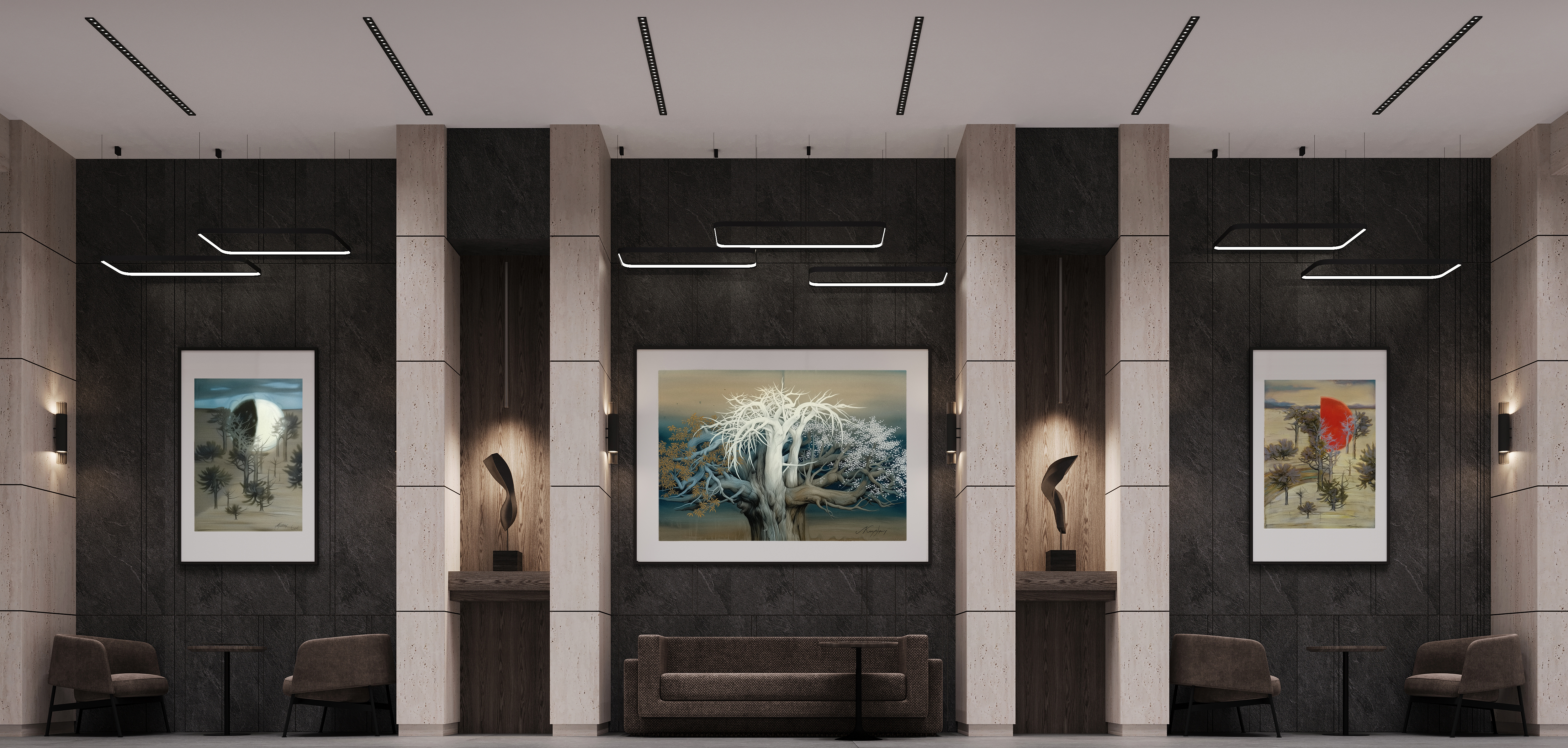 Две секции дома соединяет анфиладная галерея в стиле античных пинакотек. Здесь будут представлены картины художника Латифа Казбекова и работы скульптора Виктора Грачёва.