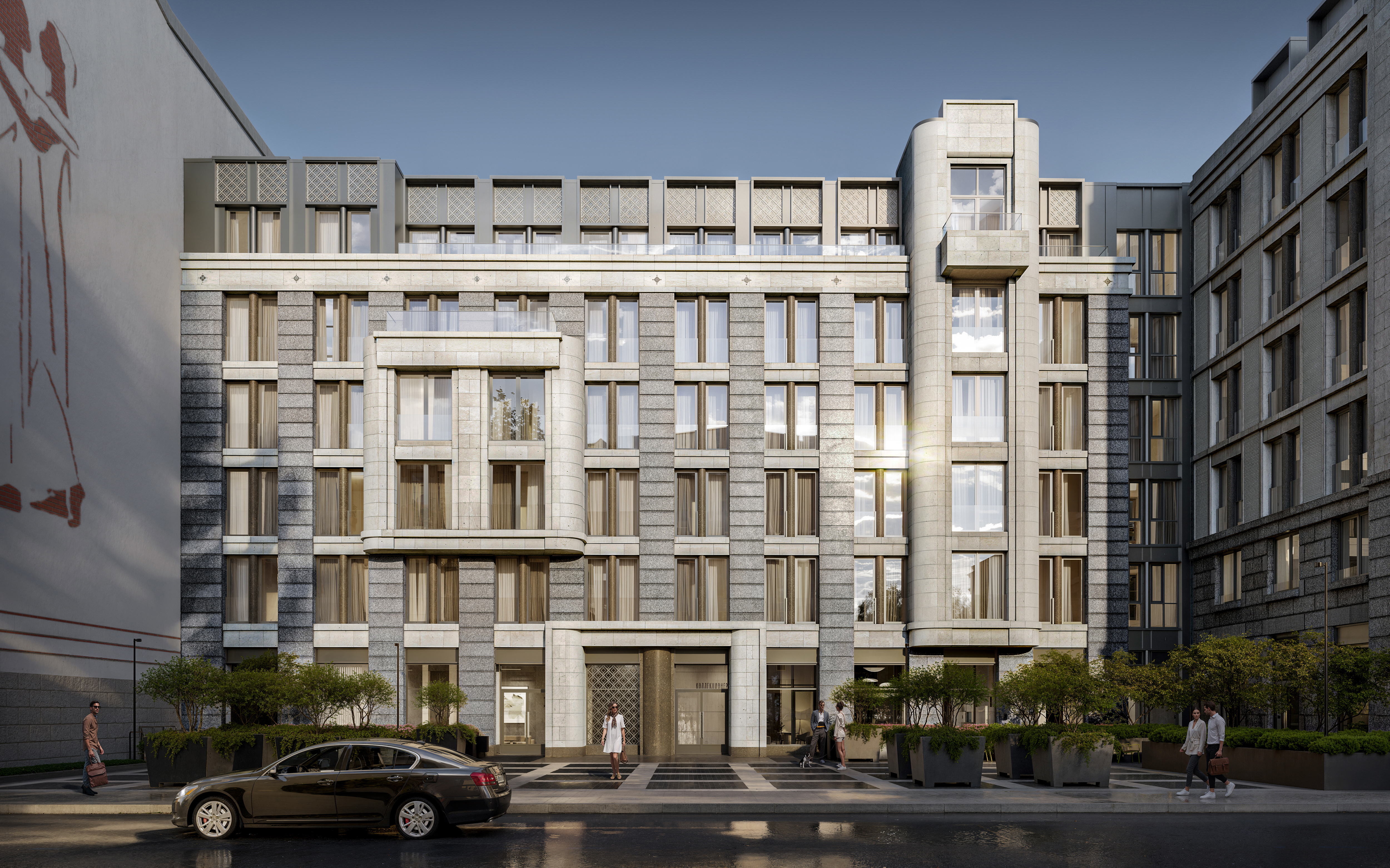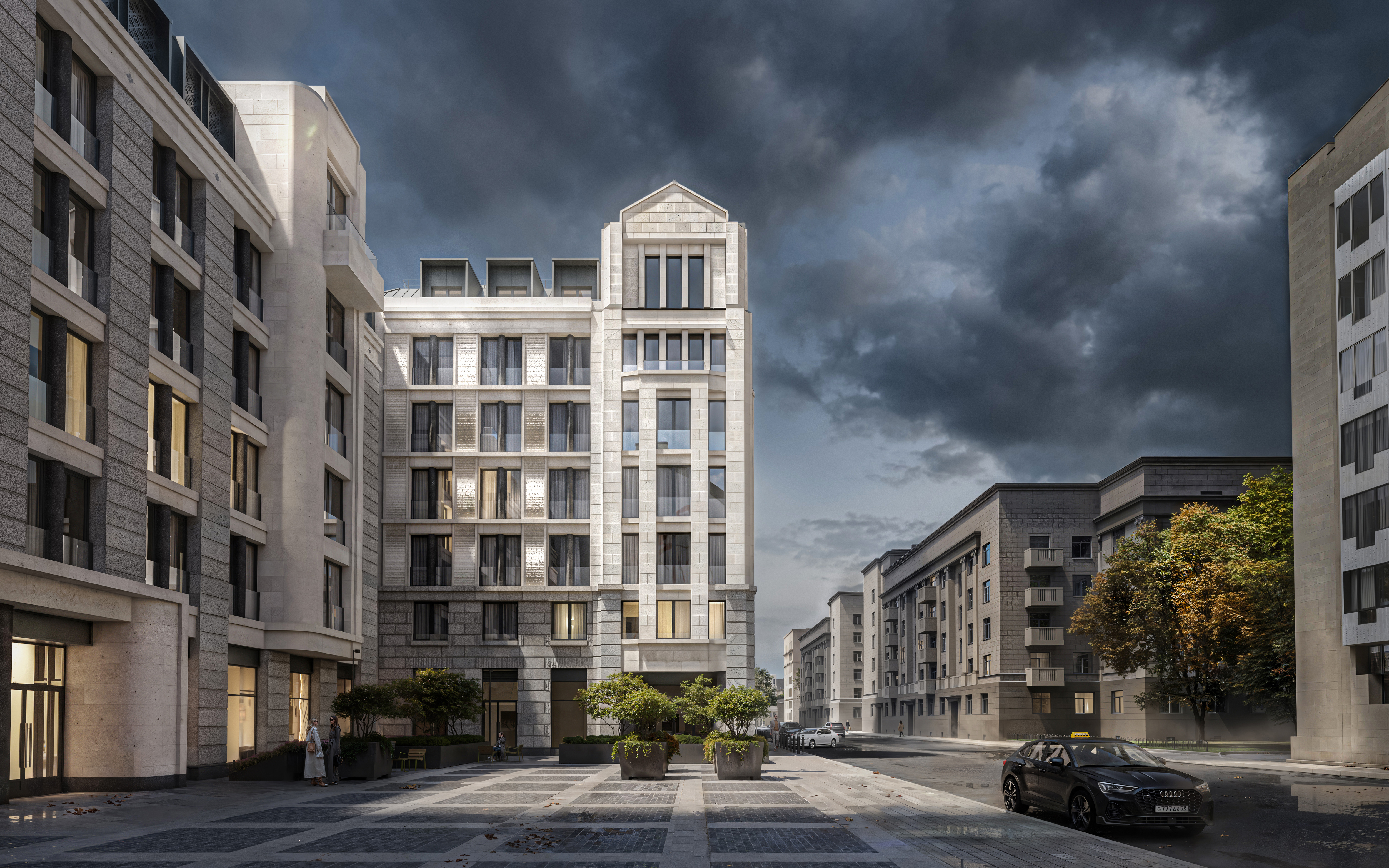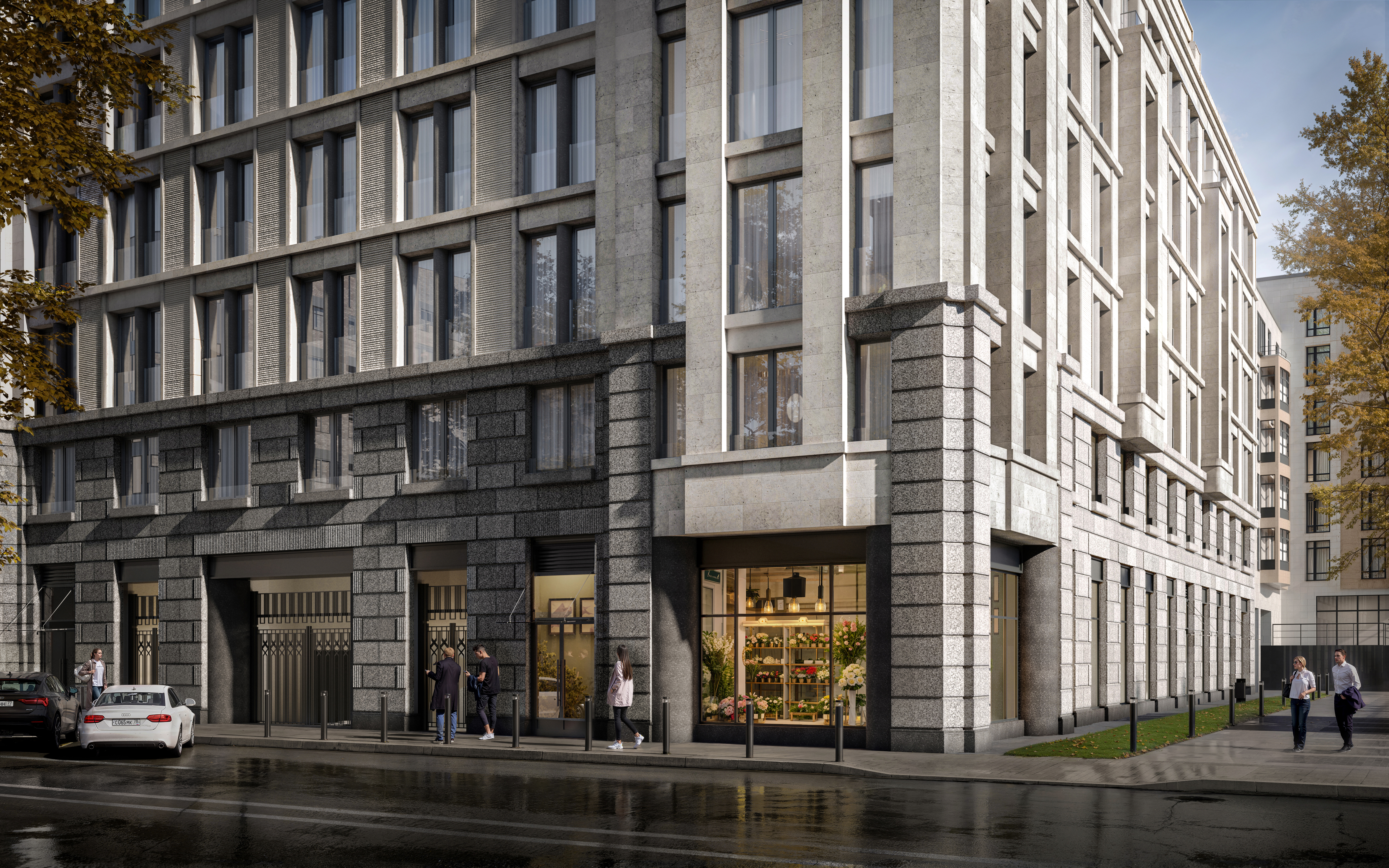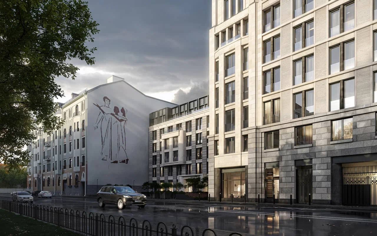 Клубный дом гармонирует с окружающими зданиями эпохи модерна.
