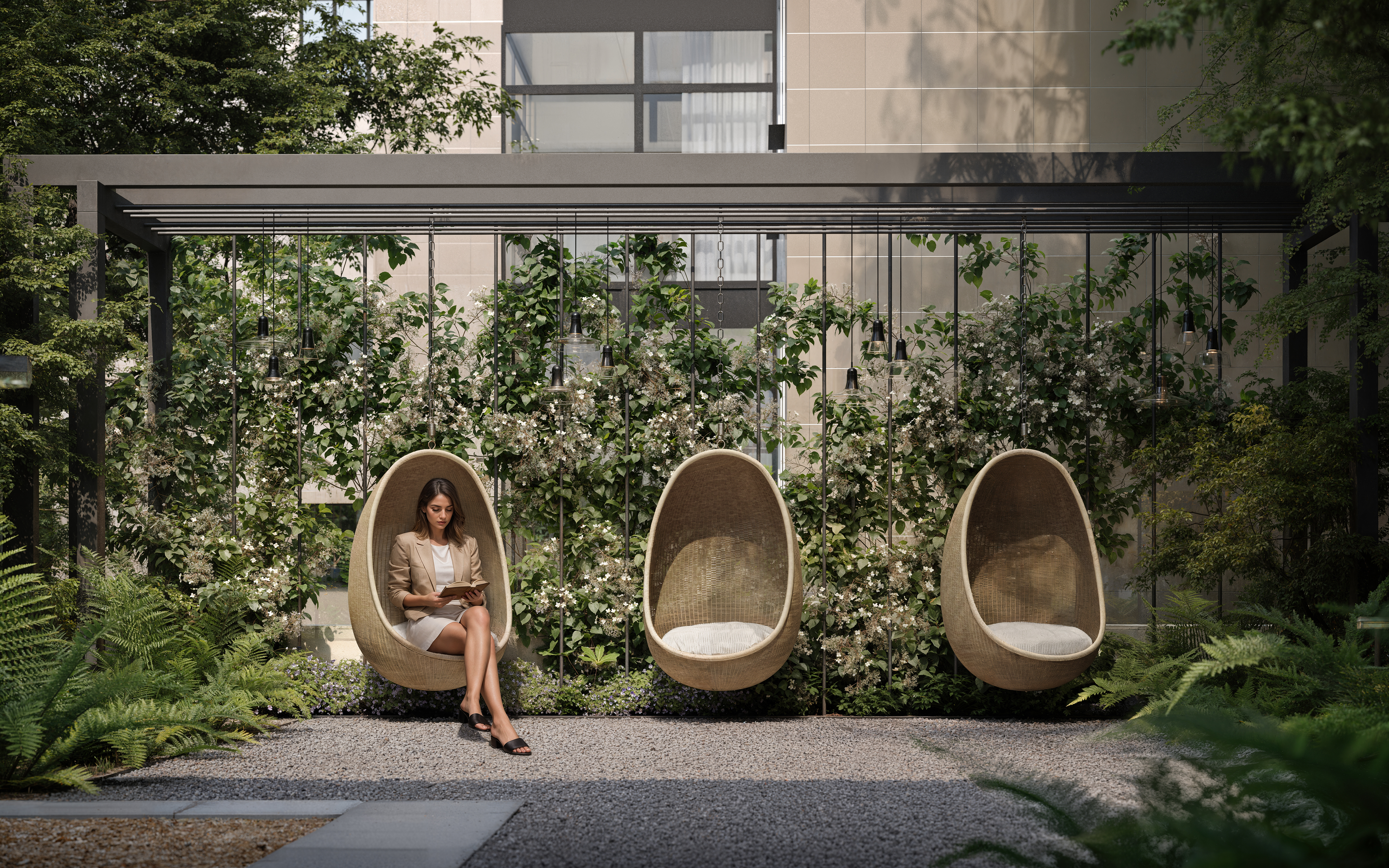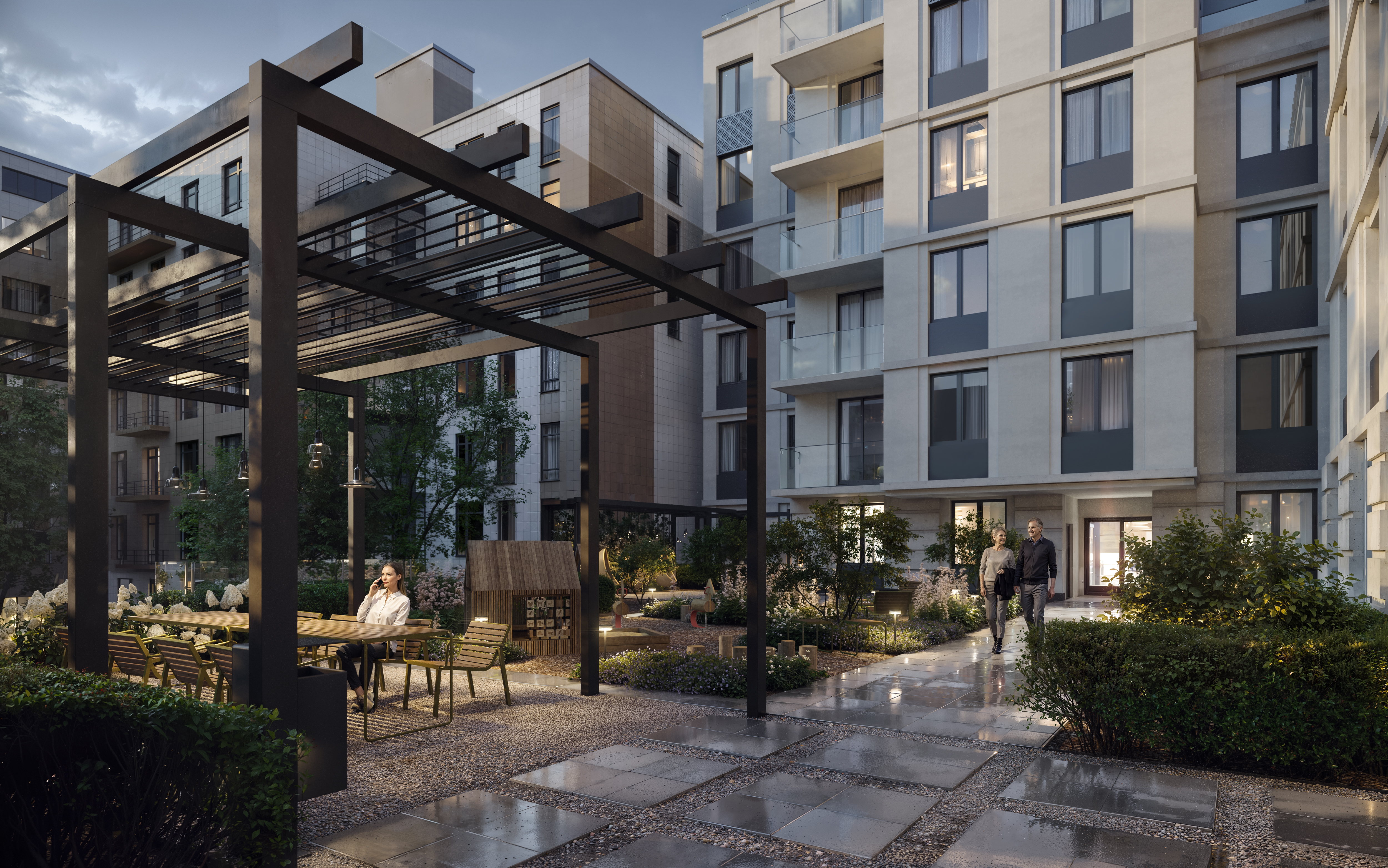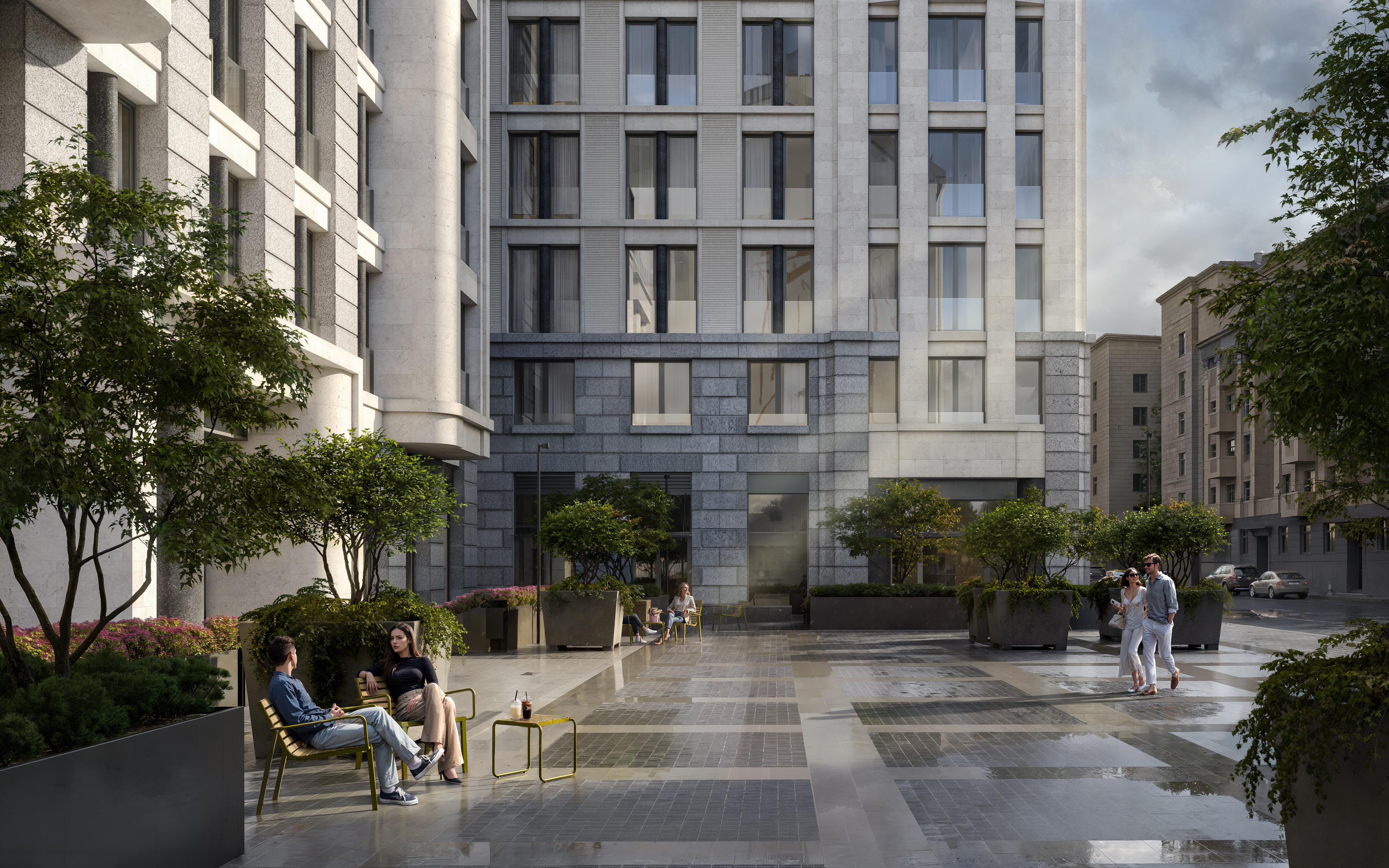 Со стороны улицы Чапыгина ограждения не предусмотрено. Здесь появится уютный открытый двор с лаунж- зоной, где разместятся удобные кресла и декоративные куртины с растениями.