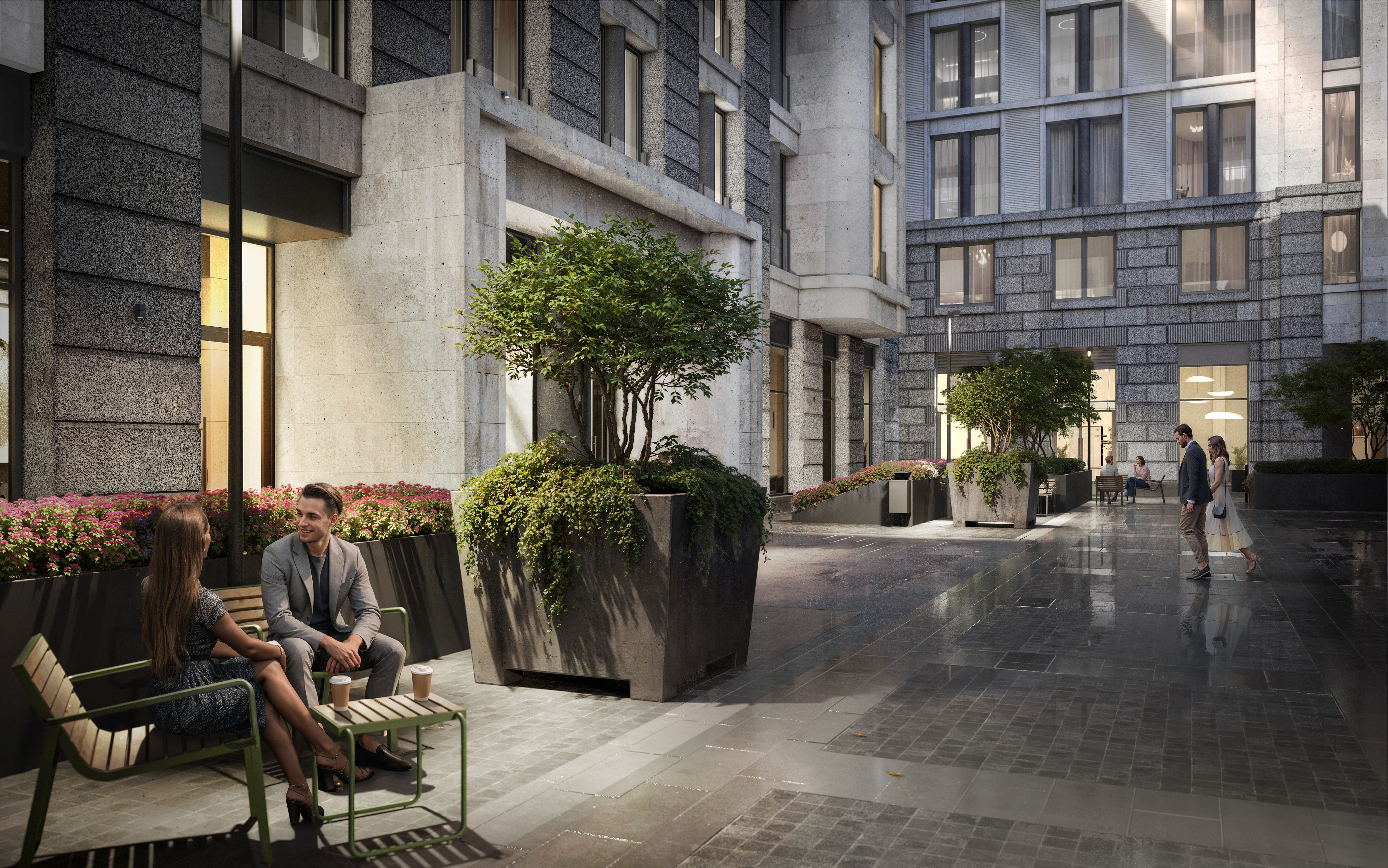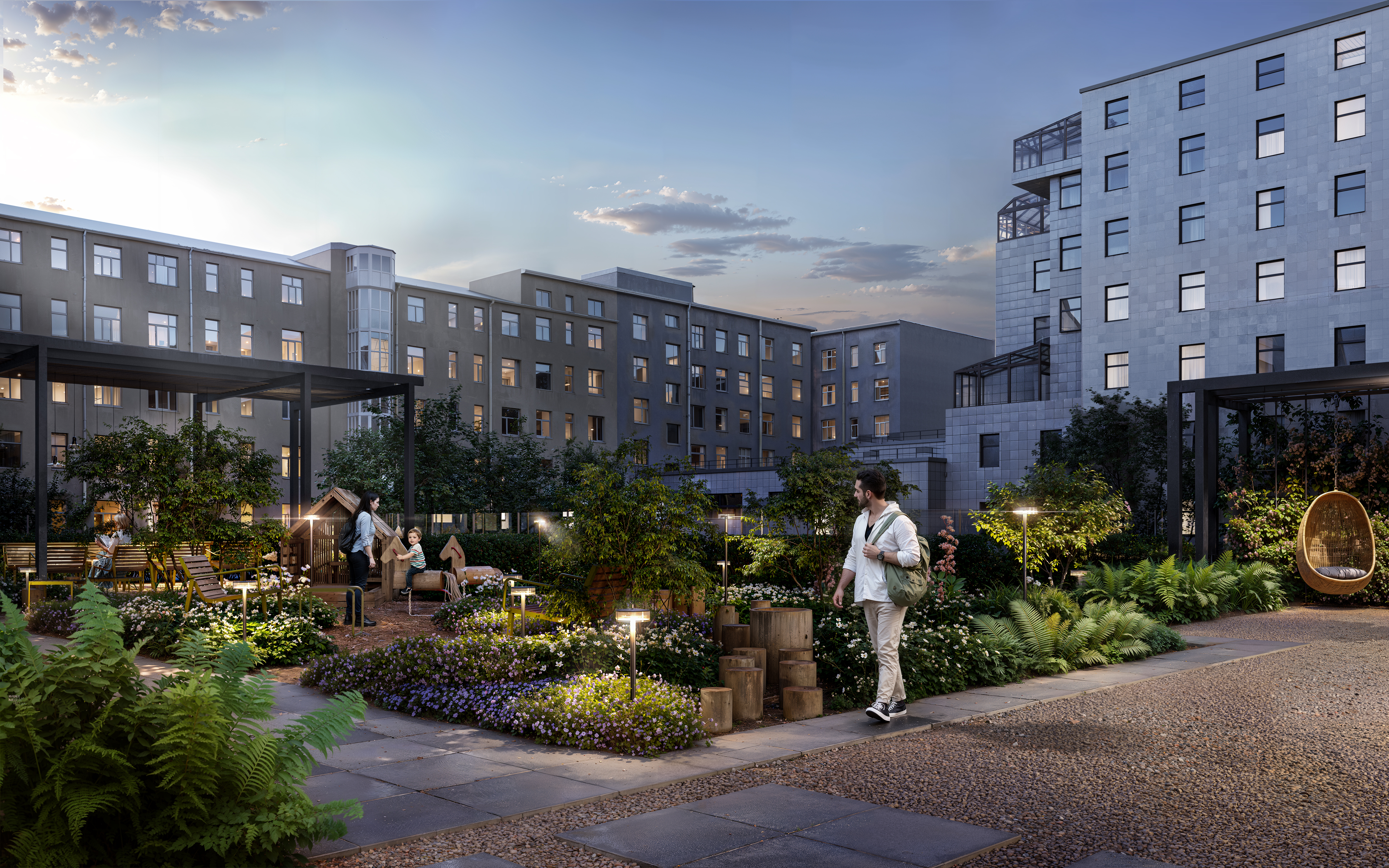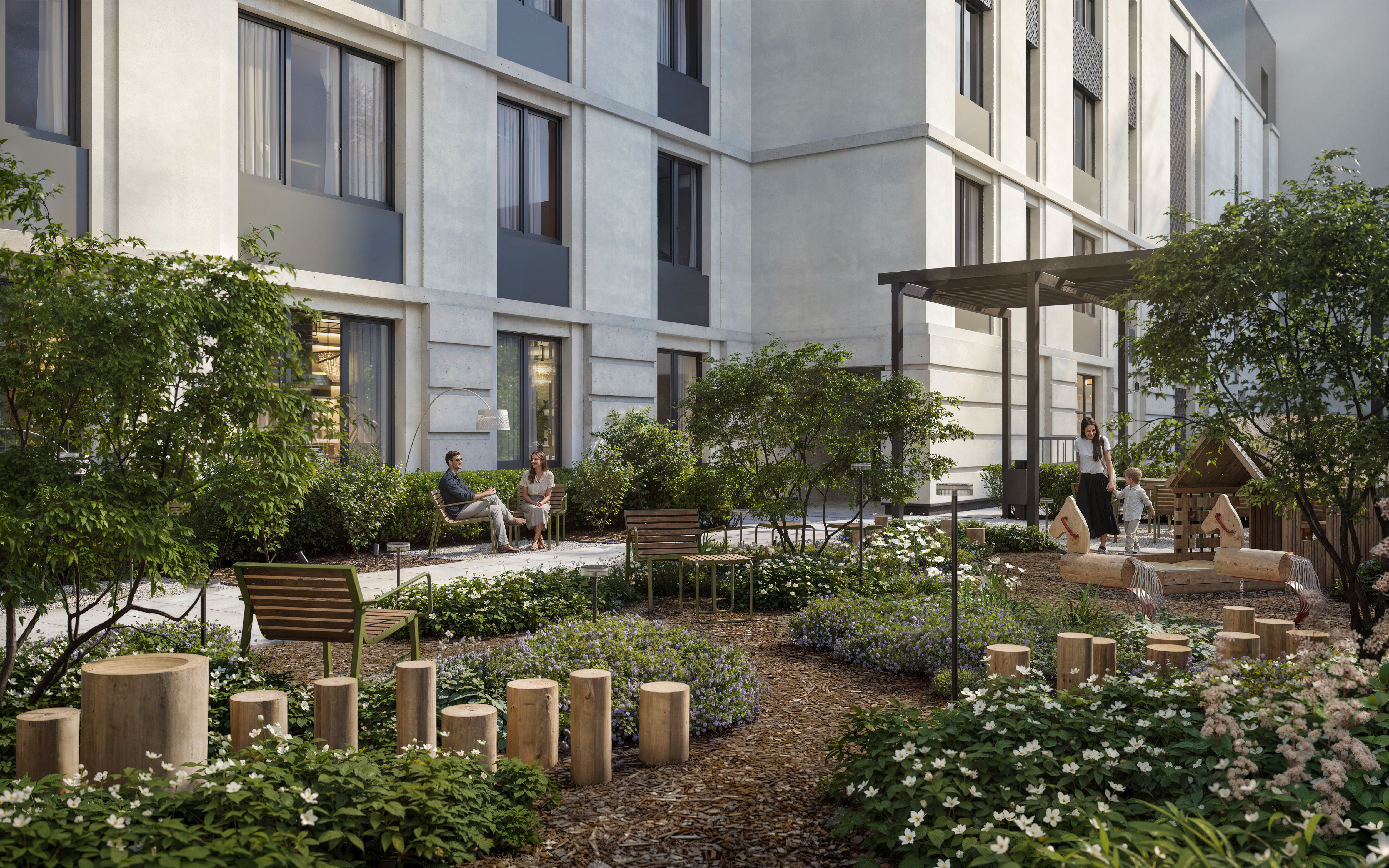 Со стороны улицы Чапыгина ограждения не предусмотрено. Здесь появится уютный открытый двор с лаунж- зоной, где разместятся удобные кресла и декоративные куртины с растениями.